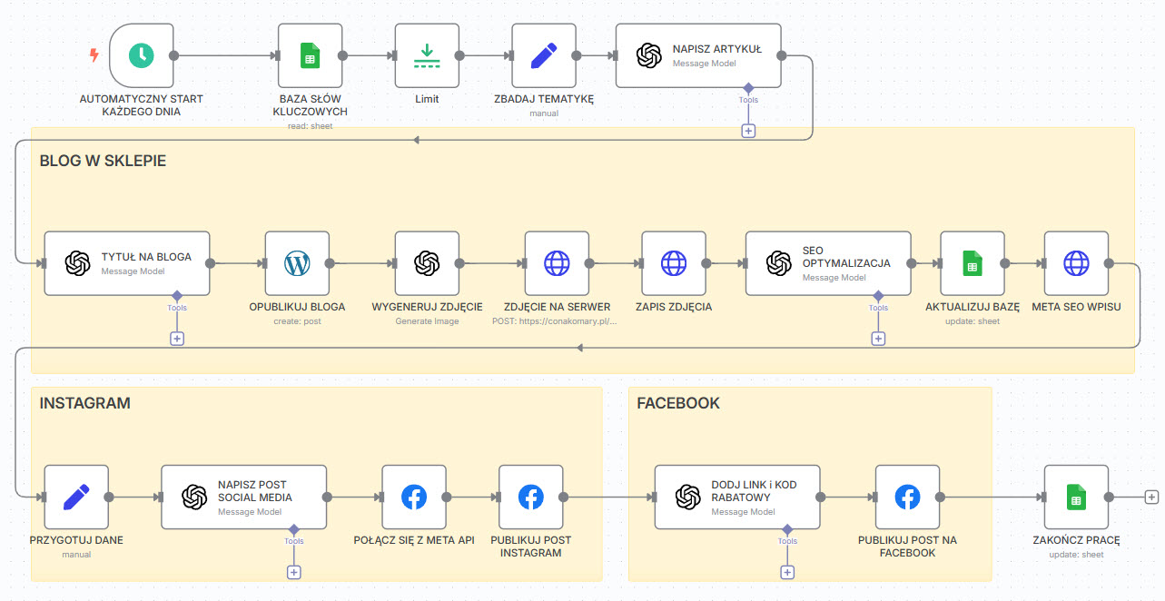 • N8N – to platforma do automatyzacji wszelkich zadań w sklepie, która pozwala użytkownikom tworzyć treści z użyciem narzędzi AI